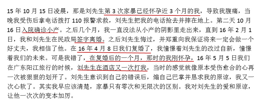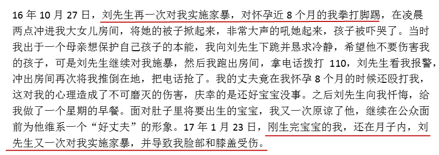 并且在妻子怀孕八个月的时期,都能狠下心对她拳打脚踢,17年1月23日,生下孩子不久的她,再一次被刘洲成家暴。