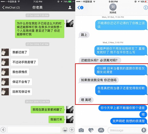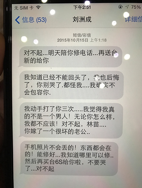 林苗在声明里提到,在15年10月15日怀孕三个月期间,刘洲成第三次对她进行家暴导致小产,随后两人签字离婚;两个月之后刘洲成表示会改过自新,挽留了这段婚姻,但复婚后的一个月旅行途中,在妻子再次怀孕的情况下,又一次对妻子进行家暴。