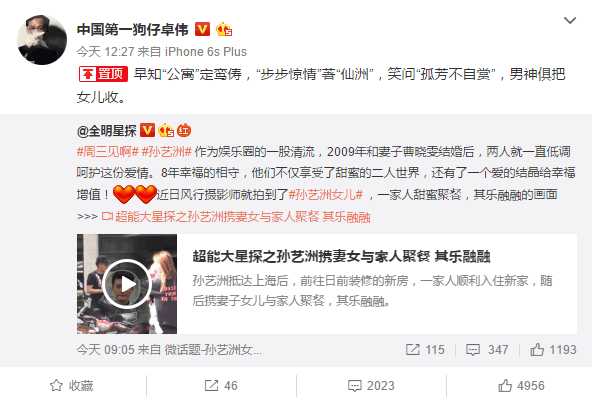 其实卓伟也不是第一次这么评价孙艺洲了,早前拍到孙艺洲看房子的时候,卓伟评价他,还用到了《爱莲说》的词“出淤泥而不染 濯清涟而不妖”,要知道对于资深狗仔而言 ,这种评价的份量有多重。