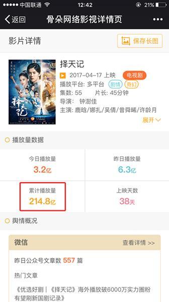 52城实时数据显示,5月25日《择天记》收视率0.905%,市场份额5.772%。骨朵影视数据显示,《择天记》开播38天,全网播放量突破214亿。