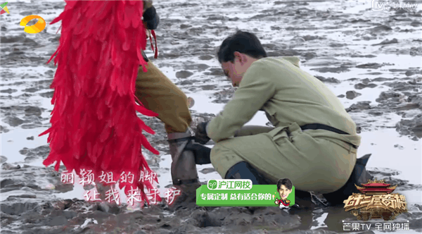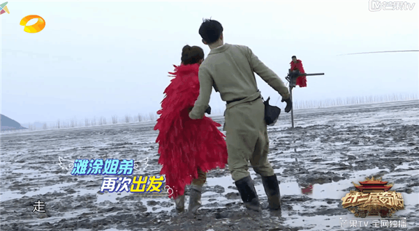 绑好鞋之后,浩浩荡荡的两个人欲要完成一番大计,官方还盖章两人是“滩涂姐弟”。