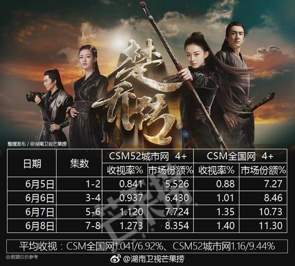而《楚乔传》的收视情况在稳步提升中,其中7/8单集双网收视均破1,稳居同时段全国第一,也是今天唯一城市网&全国网平均收视均破1的周播剧。