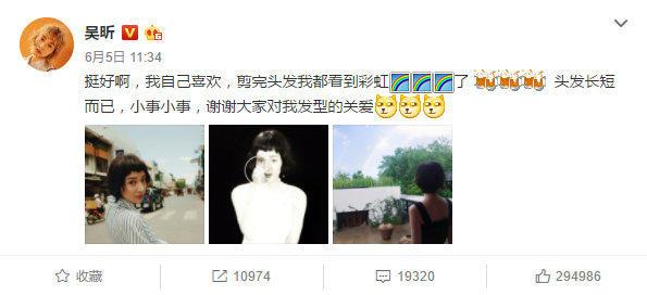 但吴昕自己看得挺开,她说自己喜欢,剪完头发都看到彩虹了,还说都是小事小事,谢谢大家对她发型的关心。