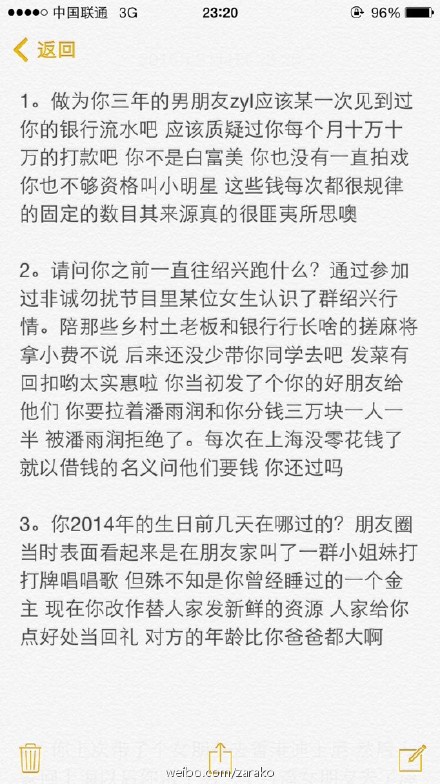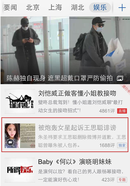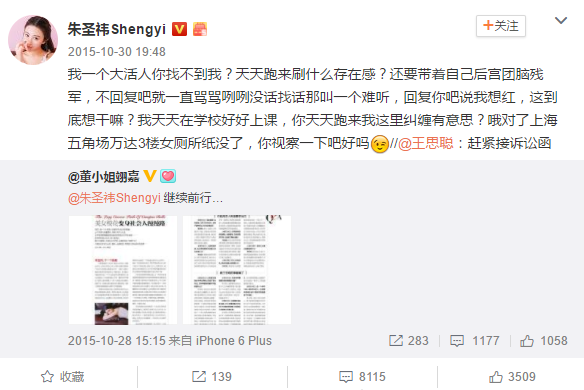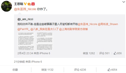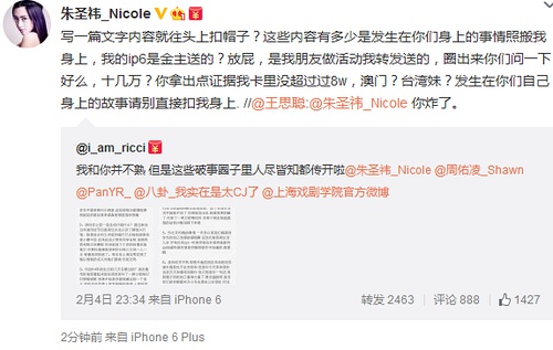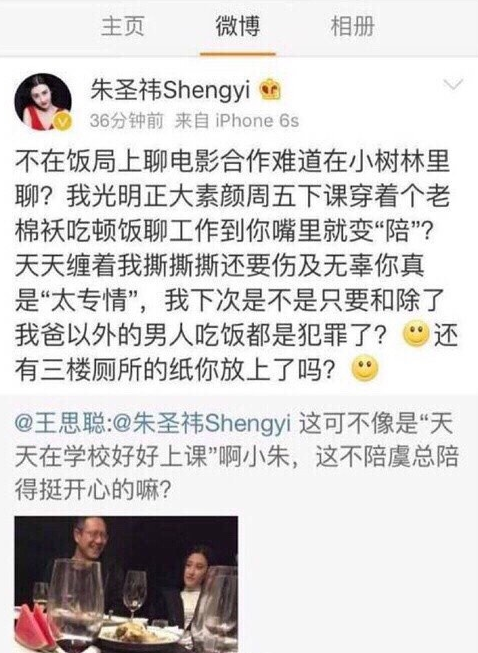 大家都知道,王思聪作为娱乐圈的“纪检委员”,向来是不怕与人撕X,特别是女的...2015年2月4日,王思聪转发“PanYR_”的微博,称女演员朱圣祎“为入上戏出卖闺蜜,称其不仅被老男人包养,更把同学介绍给其他老男人拿回扣。”