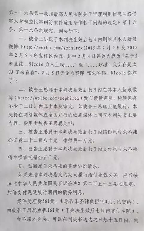 直到2016年12月28日,该案件一审判决下来了,法院要求王思聪赔偿朱圣祎所有讼诉费之外,还要赔偿朱圣祎精神损失抚慰金5000人民币,同时删除微博并在微博对其发布公开道歉声明。