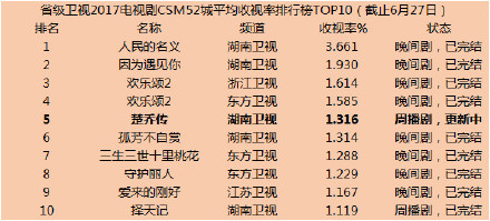也正是由于这段剧情的更迭,收视率方面也传来喜报,截止6月28日,《楚乔传》网络播放总量已经突破了150亿,CSM52城最高收视率破了1.8%,在2017年卫视电视剧平均收视率中已经达到了第五的位置,另外由于《楚乔传》还在更新中,所以绝对有望冲击前三。