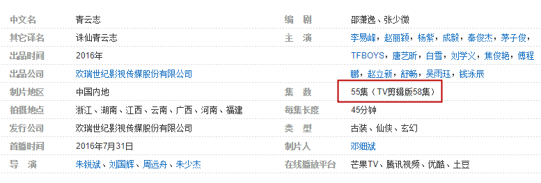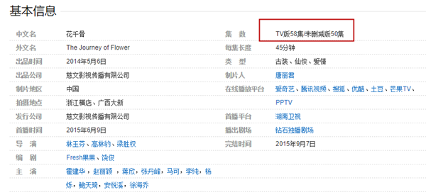 而更夸张的其实是同样在湖南卫视大爆的《花千骨》,未删减版是50集,而TV和网络版都是58集...(不包含广告),硬生生多出8集,还有谁?