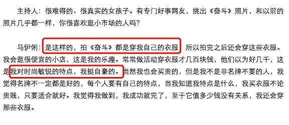 08年马伊琍接受采访的时候就说过那些被网友吐槽的七彩吊带背心全是她的私服,她以穿便宜货穿出时尚倍感自豪。当时的采访,真是满满的自信,小编看了也是欲哭无泪。