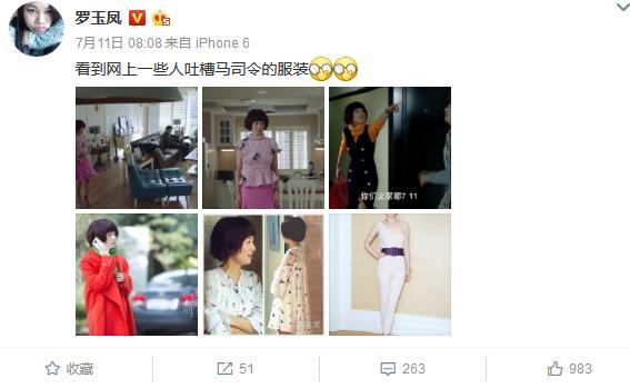 然而,马伊琍饰演的阔太罗子君,却因为穿着遭网友狂吐槽。连凤姐都忍不住发微博调侃。