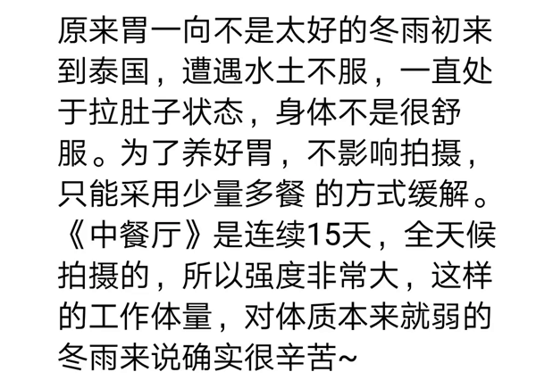 因为周冬雨一直患有肠胃炎,在上中餐厅之前就全麻做了肠胃镜,情况很不好,暴瘦也有很大一部分原因是因为这个,而且周冬雨带病录制《中餐厅》后,也没有什么好转,反而一直腹泻,这些在节目中都没有提及。