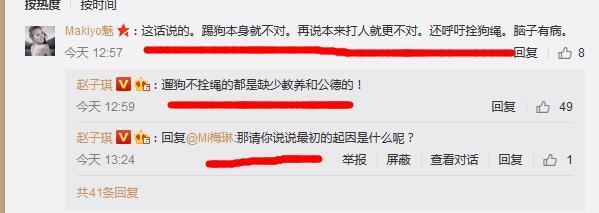赵子琪的呼吁也引来网友吐槽!!这话说的。踢狗本身就不对。再说本来打人就更不对。还呼吁拴狗绳。脑子有病。