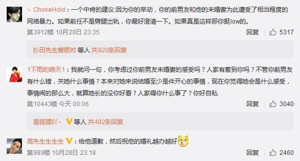 也有一些理智的网友,留言要客观许多,认为小仙女的行为太幼稚,如果前任是渣男还可以理解。但小仙女这番公开怼前任的行为,给前男友和他的未婚妻带来很大麻烦,也许被人肉,被网络暴力伤害,有的直接要求小仙女给前任道歉。