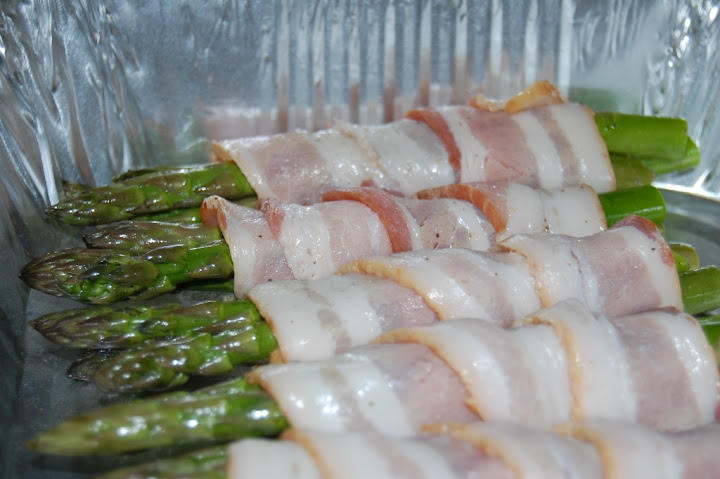 用一条培根卷三根笋,再烤盘里依次排开。上烤箱400度,大概15分钟左右,观察等培根有些脆了,笋变软了,拿出来。