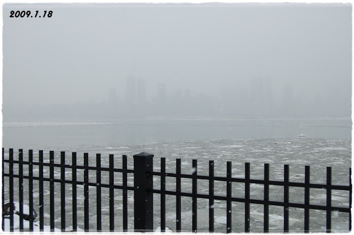 纽约下起雪来真是‘漆白一片’。使劲使劲的看才能看见对面麦哈顿的高楼。河上不漂飞机了,改漂浮冰了