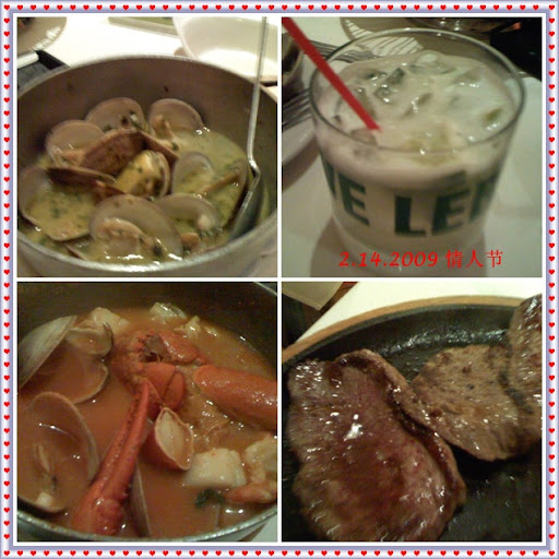 。他老人家足足用了半个小时敲了一个EMAIL,一长串的天文数字,费死牛劲了。好不容易好不容易俺们的罗曼提克的晚餐可以开始了.....左下角是俺最喜欢的龙虾汤,托爸点的是一成不变的血了吧唧的大肉。