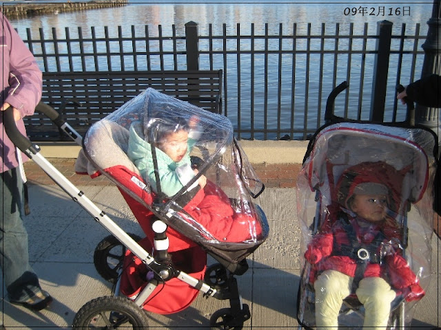 看着看着,巧遇保姆团里的一个孩子,小女孩,比小托大一岁,两个人隔着塑料皮儿对望,呵呵