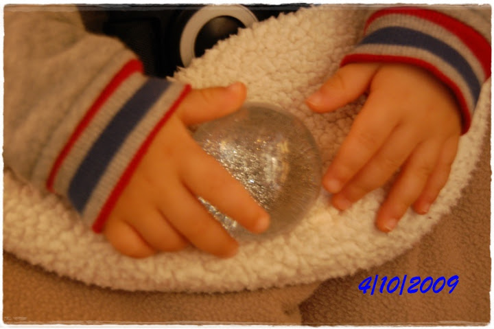 水晶球不是水晶做的,其实就是个塑料球但是做工非常精致,里面是银色的沙子状的颗粒可以游来游去的。我真怀疑这个水晶球有magic,不然小托咋老不放手啊,睡着了还抱的这么牢?