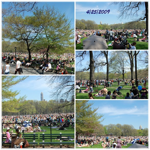 公园里游行的,骑单车的,滑旱冰的.....纽约人太爱太阳了。想想今年的春天压根没有,星期五还穿大衣呢,星期六公园里的姑娘们全换上穿比基尼了。今年我的PP风衣全没机会穿~~