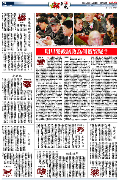 今年兩會期間,明星代表、委員再度成為關注的焦點。關注度是這些明星代表、委員到會了沒有?他們有什麼建議和提案,是不是關注民生的,質量如何?有人說,政協是「名人+明星」,與老百姓距離遠。這句話雖有失偏頗,但也不是空穴來風。這幾年明星參政議政一直遭到民眾的質疑,其原因是明星們沒有珍惜這份榮譽,有的連續兩年缺席會議,寫的建議和提案並沒有深入調查研究,而是匆忙應付。明星也是成功人士,理應得到社會的尊重,但讓他們去當人大代表、政協委員,並不是合適的尊重方法,人大代表、政協委員不是榮譽稱號,而是為國為民獻計獻策的謀士。如果他們的確具備參政議政的能力,應該有一定的程序進行審核或選舉,而不是在其成為明星之後,就「黃袍加身」。