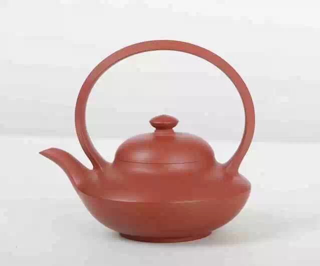 手拉朱泥提梁壶《圆》,是用一个“圆”字贯穿始终的作品,梁、的、盖、身、底、嘴,所有的构件都是圆的。梁犹如一条巨大的彩虹,意华光普照;的如“1”字,圆筒身,意“一筒(统)江山”;底圆球形,意大地母亲;嘴如腾飞的巨龙。肩的上半部又犹如一轮圆月。作品气度非凡,润泽生辉,且意境深远,达到艺术性与实用性高度统一的妙境,是一件罕见的艺术珍品。