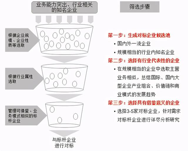通过三步骤选择标杆企业:生成对标企业候选池—选择有行业代表性的企业—选择具有借鉴意义的企业。