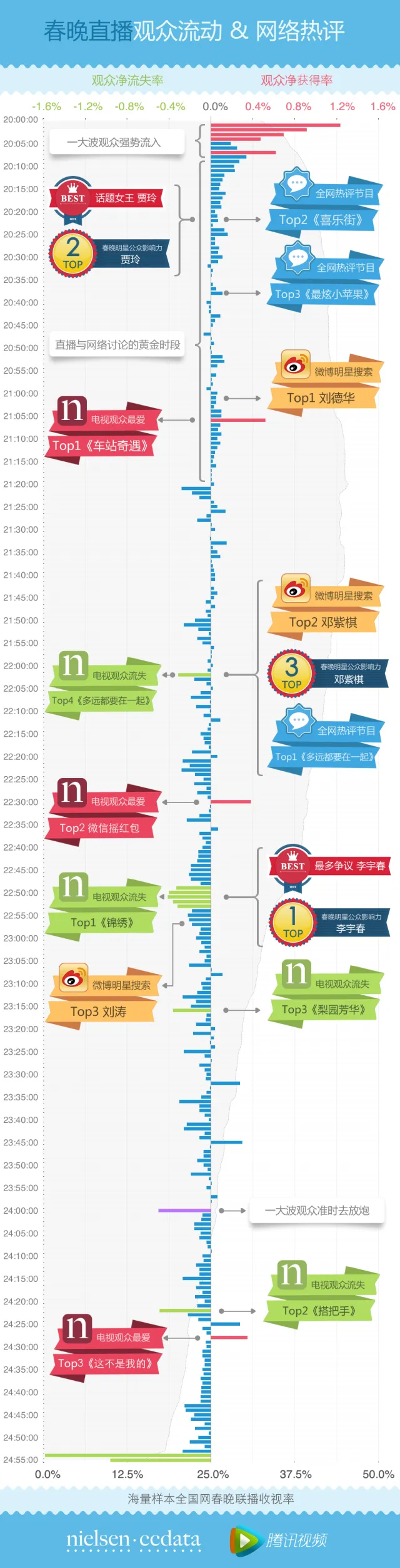 1.黄金阶段,从20:00到21:20电视观众几乎无没有流失,与此同时产生了大量针对这段节目的互动话题和网络评论,其中语言类节目《车站奇遇》创下今年春晚直播电视观众净流入第一(剔除春晚前10分钟观众流入高峰时段)。