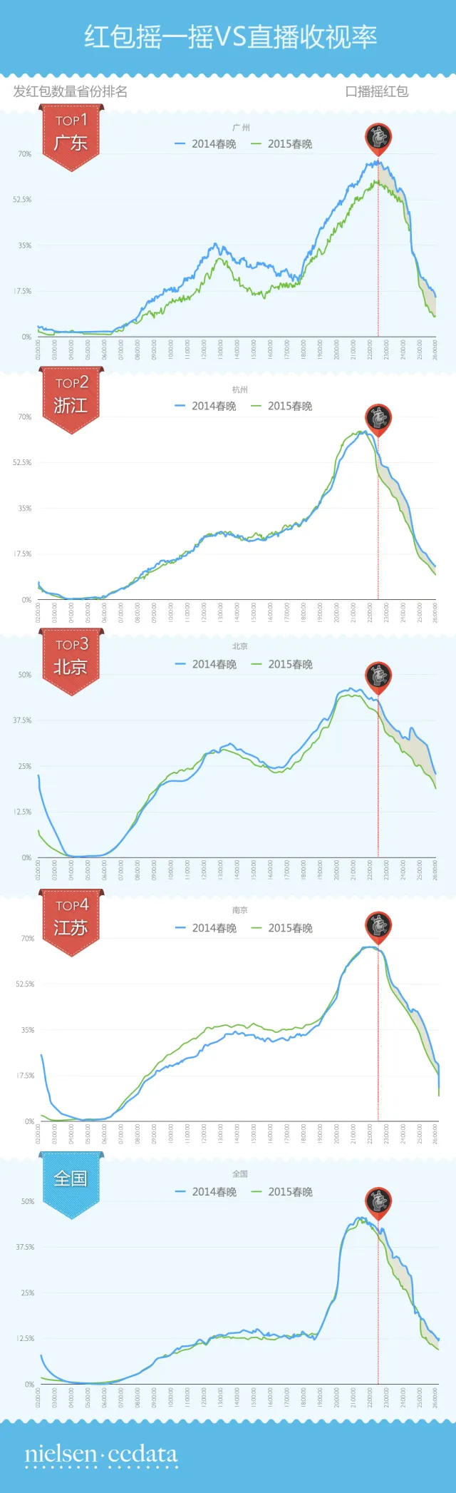 对于传统媒体亦是如此,在与新媒体融合碰撞过程中,对于电视台优质的节目内容是沉淀和挽留用户的关键,未来传统媒体和新兴媒体必然是你中有我我中有你,只要内容出色在什么平台上观看只是方式问题,用户的选择是多元和迁移的,并不会因为喜欢米饭而完全不吃菜。真正值得电视台注意的是成功的事件营销后有没有留住用户,当我们将今年红包发放量排名前四的省份和城市与对应有代表性的城市直播收视率对比后,发现一个不太乐观的现象,羊年春晚22:20以前的总是收视曲线与往年非常一致,但在22:30左右摇红包之后,无论参照城市还是全国网收视曲线,相比去年同一时刻出现惊人一致的显著下滑,前面我们也提到,这个时间点其实是对直播观众流入是有明显提振的,但随后如何抓住这些观众尤其年轻的观众值得电视台深思。