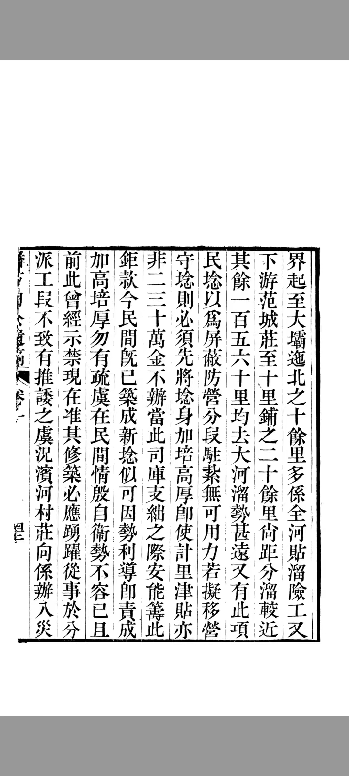 职道复查东境原筑南堤计一百九十八里,现除直东交界起至大坝迤北之十余里,多系全河贴溜险工。又下游范城庄至十里鋪之二十余里尚距分溜较近。其余一百六十里均去大河溜势甚远,民埝以为屏蔽,防营分段驻札夫可用力。若拟移营守埝,则必须先将埝身加高厚,即使计里津贴,亦非二三十万金不办。当此司库支绌之际安能筹此巨款。今民间既已筑成新埝,似可因势利导,即责成加高培厚,勿有疏虞。在民间情殷,自卫势不容已。且前此会经示禁,现在准其修筑,必应踊跃从事,于分派工段不致推诿之虞。况滨河村庄向系办入灾区,本年两季丰收,民力尚不致竭獗。