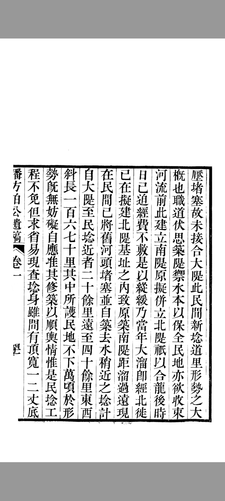 职道伏思筑堤御水,本以保全民地,亦欲收束河流。前此建立南堤原拟并立北堤。只以合龙后时日已迫,经费不敷,是以纵缓。乃当年大溜即经北徙,已在拟建北堤基址之内,致原筑南堤距溜过远。现在民间已将旧河头堵塞,并自筑去水稍近之埝。计自大堤至民埝近者二十余里,远至四十余里,东西斜长一百六七十里。其中所护民地不下万顷,于形势既无妨碍,自应准其修筑以顺舆情。惟是民埝工程不免,但求省易。现查埝身虽间有顶宽一二丈底宽五六丈高七八尺之处,然不及此丈尺者居多,且土性松浮,硪工又少,以之御水恐不足恃。