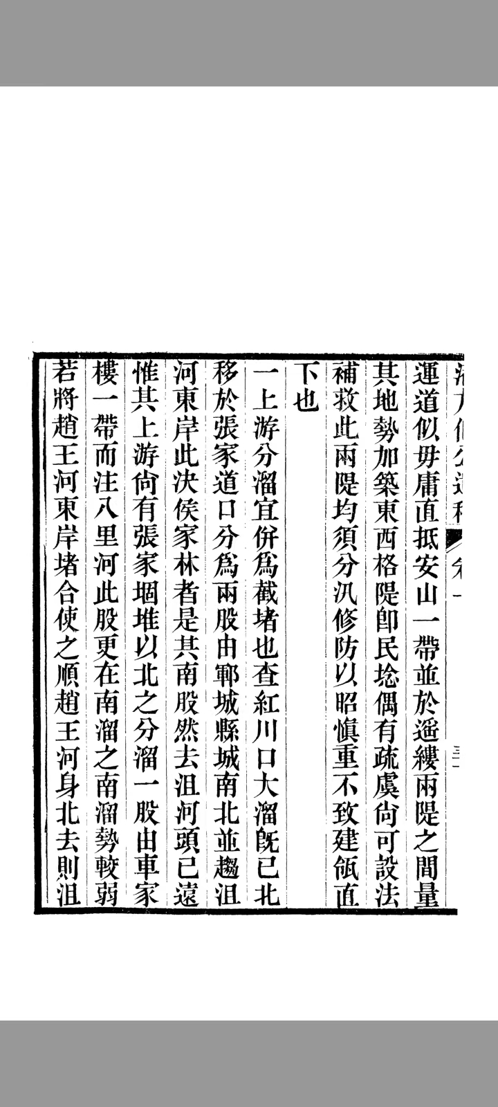 〓上游分溜宜并为裁堵也。查红川口大溜即已北移于张家道口分为两股,由郓城县城南北并趋沮河东岸,此决侯家林者是其南股。然去沮河头已远。惟其上游尚有张家堌堆以北之分溜一股,由车家楼一带而注八里河,此股更在南溜之南,溜势较弱。若将赵王河东岸堵合,使之顺赵王河身北去,则沮河头附近并无大溜,既可放心,亦属事半功倍。