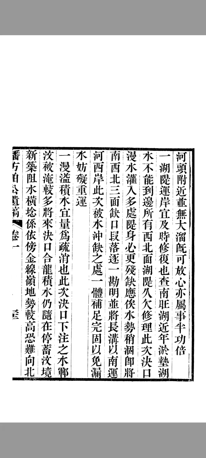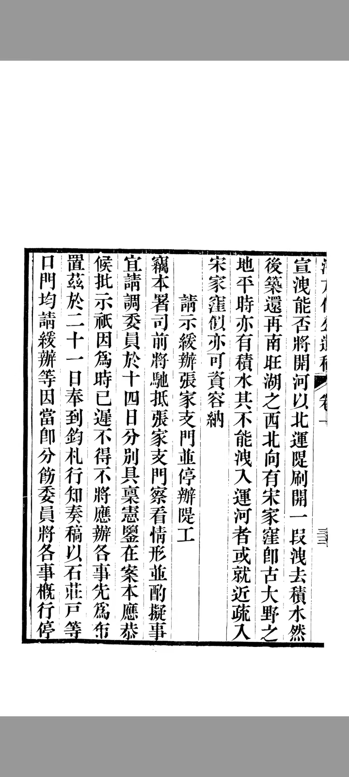 〓漫溢积水宜量为疏消也。此次决口下注之水,郓、汶被淹较多,将来决口合龙,积水仍随在停蓄汶境,新筑阻水横埝系依傍金线岭,地势较高,恐难向北宣泄。能否将开河以北运堤刷开一段泄去积水,然后筑还。再,南旺湖之西北,向有宋家洼即古大野之地,平时亦有积水,其不能泄入运河者,或就近疏入宋家洼,侅似亦可资容纳。