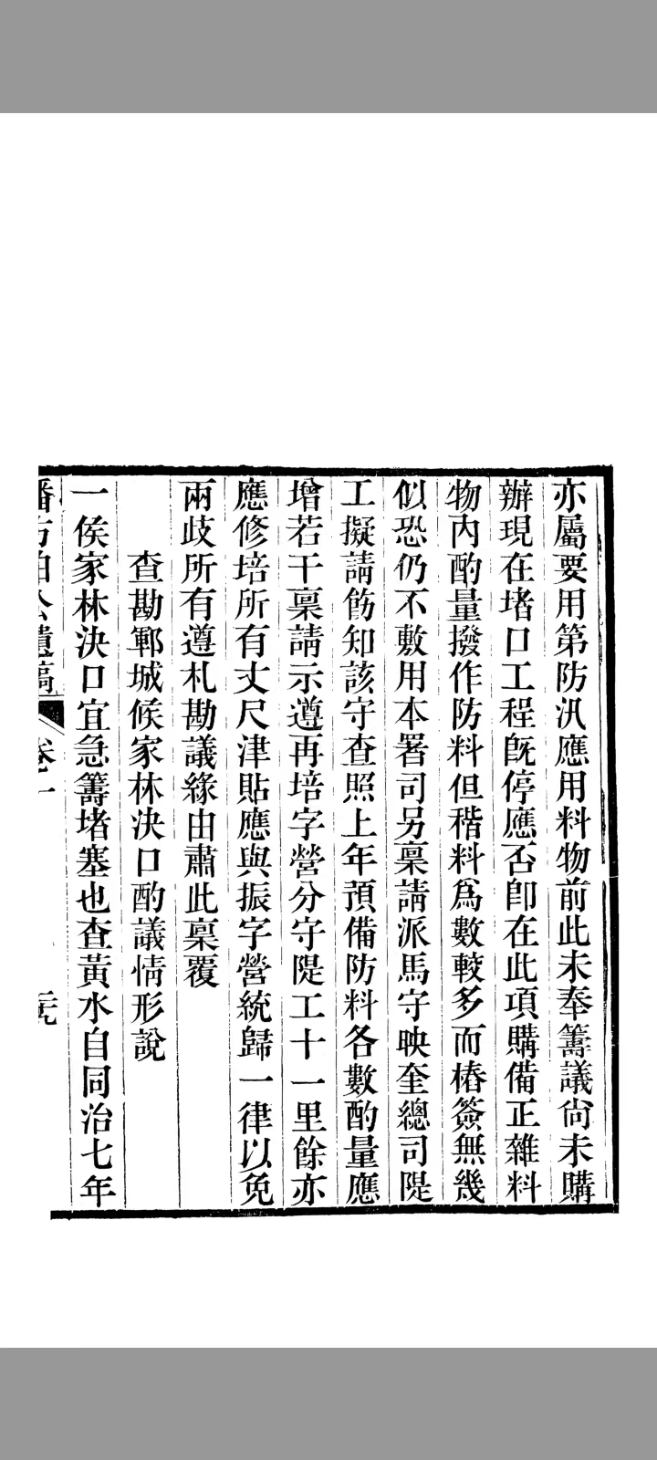 〓侯家林决口宜急筹堵塞也。查黄水自同治七年决赵王河东岸之红船口,屡堵未能合龙。复于上游另决数口,水势日趋东南。上年由沮河头溢入济河,下注牛头河,旋因水涸未为大患。今复由沮河之侯家林决口漫水,灌入南旺湖,并由嘉祥之井头河汛滥济宁西南一带归入南阳湖。是今日之侯家林即如前日之红船口,而情形尤为紧要。盖红船不能堵尚有沮河以限之,侯家林不急堵则运西略无屏蔽。幸此时灌入湖与运河者,尚系渐澄之清水。然汶、泗并受顶托,运岸已处处吃重,若来春汛发,一见浊流则受害益烈,故不但宜急堵,且必期合龙方可保全运道。此必须谙习黄河水性工程之员办理庶有把握,不但非地方官所能从事,即运河员弁恐亦未能胜任也。