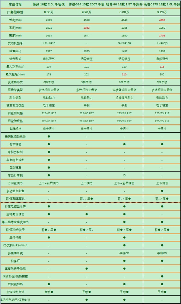 所以尽管官方调性很高,但真正明智的办法,还是找同班小伙伴们一起玩儿比较好。在上市之后的报道里,像传祺GS4、哈弗H6、长安CS75等热销车型就被媒体们拎出来解析了。选定竞争对手之后,吉利博越就得拎出一些东西来烘托其产品力。为了营造高性价比的形象,吉利博越全系配备了EBD、ESP车身电子稳定系统、BA刹车辅助系统、TCS牵引力控制系统以及像车顶行李架、一键启动、自动空调等逼格配置。