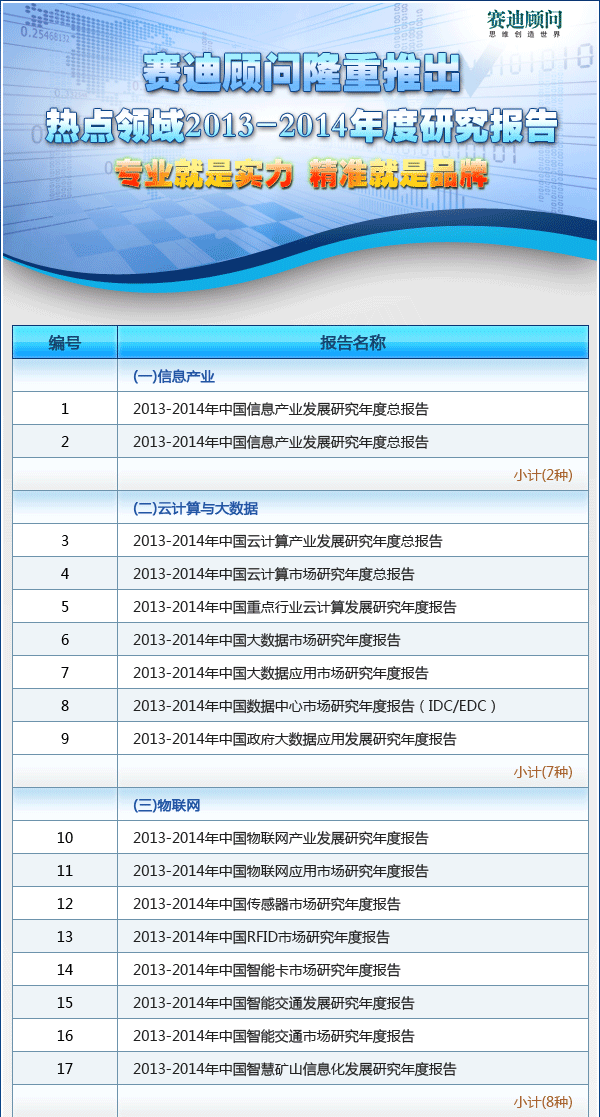 http://mmbiz.qpic.cn/mmbiz/k8DAPyTx8IjIjSvgm8wJTj6SHiaicJ8WPicwmfa1XpuiaXG5ekFOLOAPpNSNV1sWEANvicxeDuiaIeNS6BFiav50ibh0Xw/0:《2013-2014年度研究报告》名录" TITLE="赛迪顾问