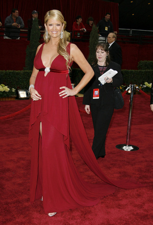 女主播南茜·欧黛尔的红裙与地毯混为一体,艳丽迷人。