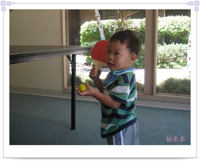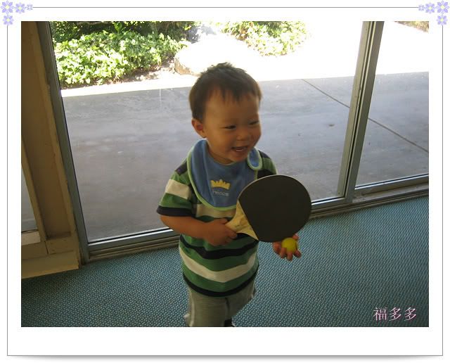 趁着MAX爸爸在烤肉,我们去打乒乓球。这可是多多第一次看到打乒乓球,看了一会儿就开始跃跃欲试。别说,他拿球拍的姿势还瞒象回事呢.