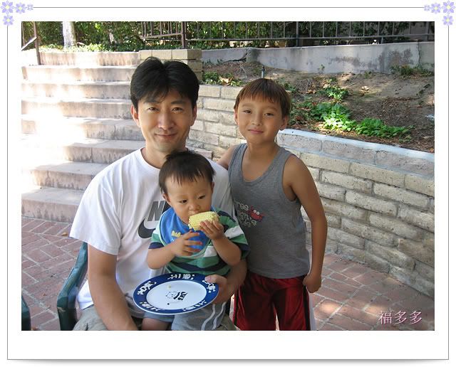 肉还没好,先吃点玉米。三个帅哥来一张。