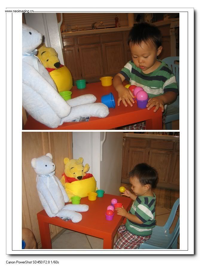 在家里没有同龄的玩伴,他就搬来了他的小熊们,也照样玩的很投入,很尽兴。