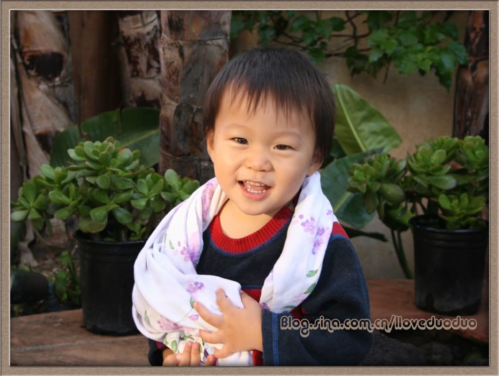 也托了回国的福,多多的中文是突飞猛进。就拿昨天来说,从小多嘴里说出来的中文就有:“给爸爸洗牙刷”,“爸爸回来了”,“饼干掉地(上了)”,"爸爸慢点开"。而且现在他还中文英文一起说。比如说他说完鞋,就会加上shoes; 说完猫马上就接上cat等等。英文现在常说的有“my turn","go away","over there","right there","dark outside",“the end"。分得清大小,高矮,长短,冷热。常常指着炉灶跟我说“烫hot" (经常警告他,看来是牢牢记住了),冰箱里拿出的东西摸一摸说“冷cool". 数数儿有点独特,我们的顺序是"one,two,three,five,nine,ten", 四六七八都省略不计了。给他三个苹果会很认真的数"one,two,three",然后告诉我three apple(s). 有时瞎猫碰到死耗子,可以数对五个实物。