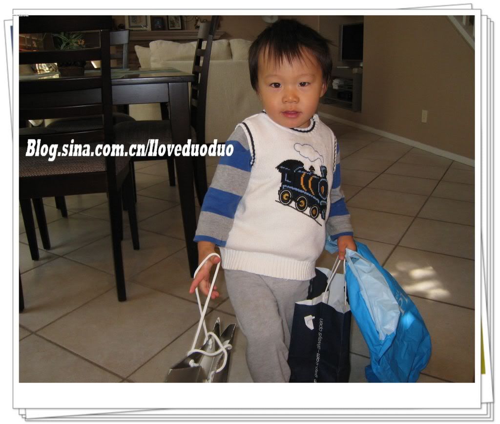多多喜欢去商店购物,不管是食品店还是服装店他都喜欢。在家的时候就喜欢翻出购物袋,假装要去出门购物,临行前,还要和爸爸妈妈说“byebye".
