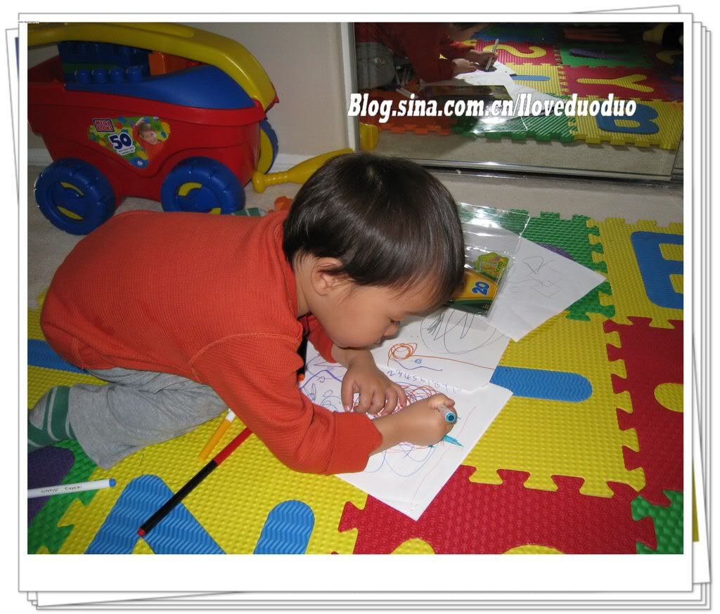 从一岁起到现在,我们一如既往地表现出对涂鸦的热爱。每天必做的一件事就是要画画。现在我们开始用电脑软件作画了。不过毕竟电脑不能取代传统的纸和笔,最近我又给他买了一大盒的绘画工具作为我送的圣诞礼物。看看"大师"作画的神情有多么专注。