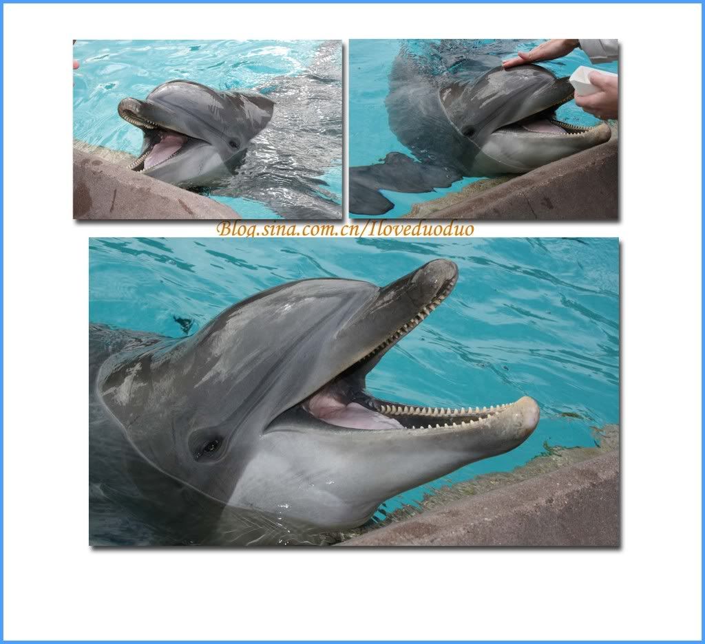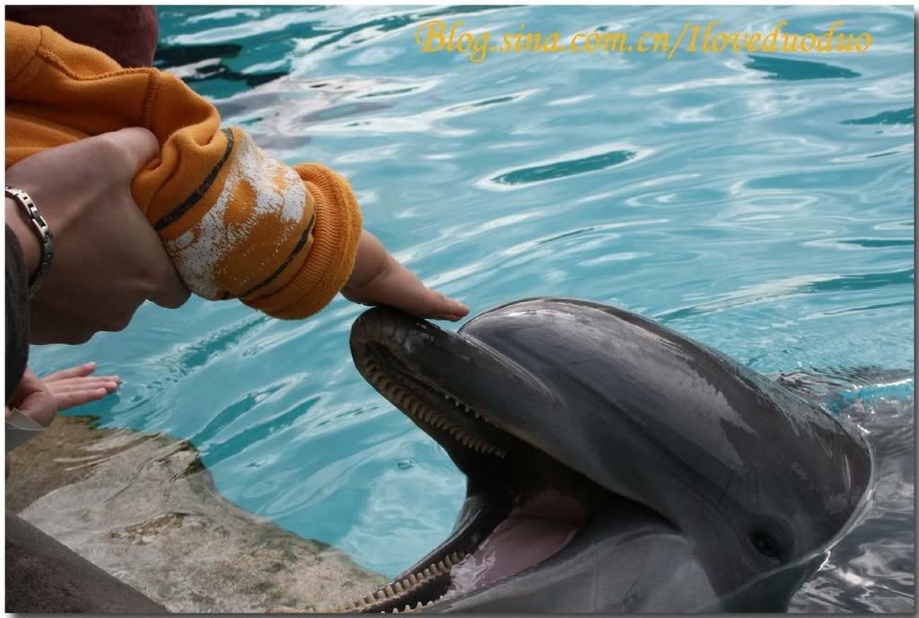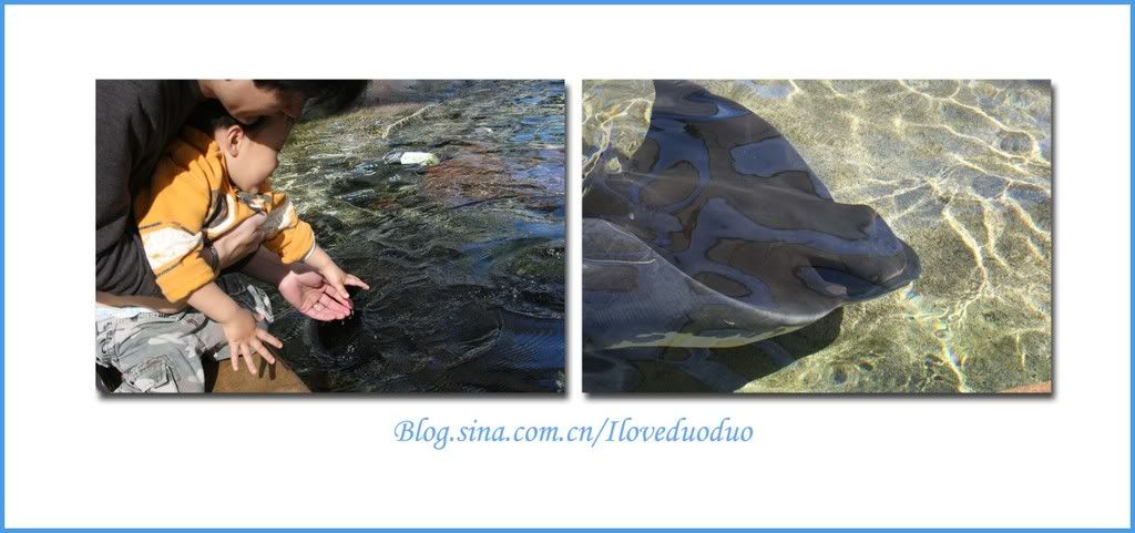 ray,不过我们把喂小鱼的机会留给了海豚。一盒小鱼大概是四条收五美金,买了鱼以后就可以去一个专门的区域去喂海豚。专业人员告诉我们先把一只手臂伸出去,手掌朝下,海豚看到这样的姿势就会游过来。在喂食以前要先去抚摸它,然后在往它们的嘴里扔鱼。多多这次一点都不害怕,一盒鱼都是他喂的。看到身边游人快乐地和海豚互动着,这种人与动物的和谐让我有点小小的感动。不过一盒小鱼实在是太少了,吃完后海豚还张着嘴叫着,期待着更多的食物,对不起了,下次我们还来喂你们。