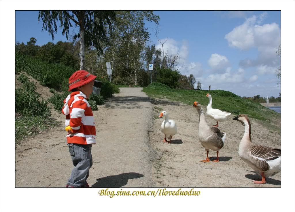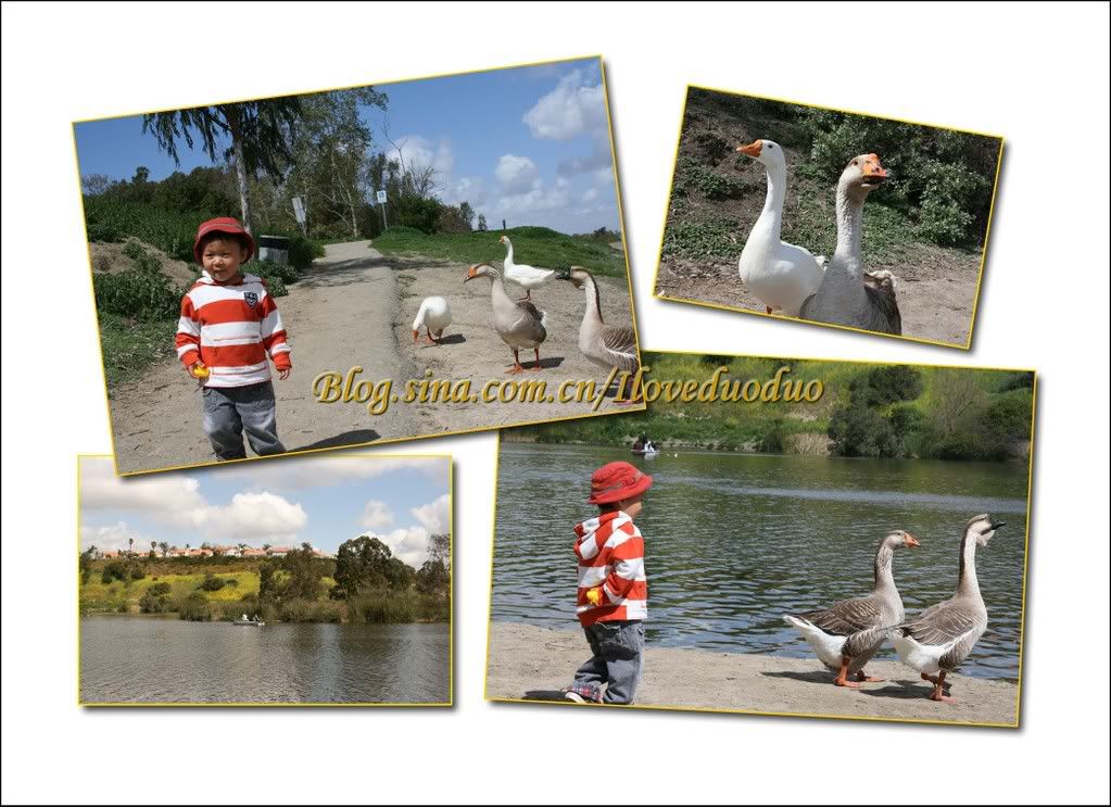 这个公园Laguna Niguel Regional Park有一个湖,湖边到处都是觅食的鸭鹅们。它们看见多多手里拿着的小鸭子玩具,认准了一定是吃的东西,于是奔着多多就过来了,而且跟着他屁股后面一路尾随。小人很喜欢这群stalker,不过很快就从被尾随转向自卫反击,主动挑逗,一直追到它们无路可逃跳到水里为止.