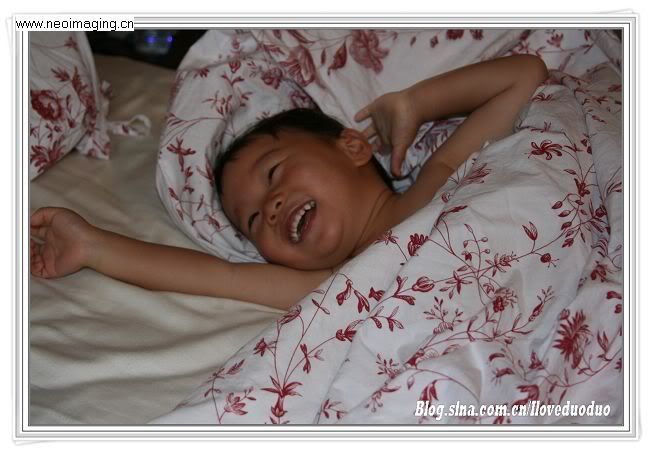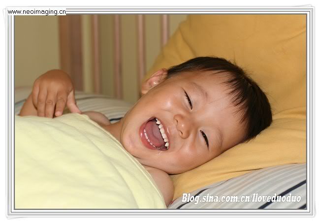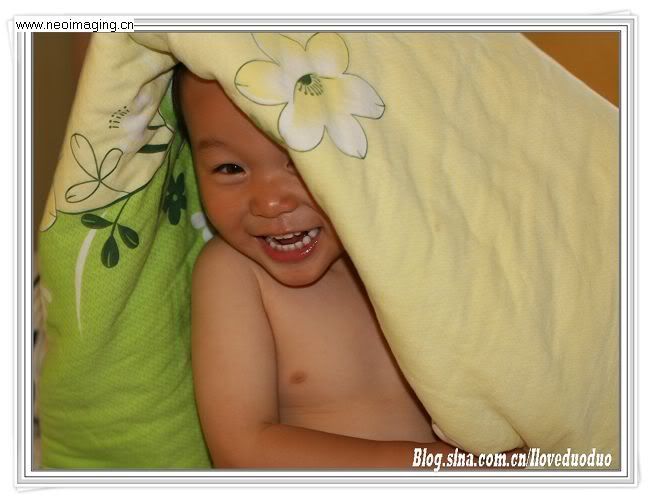 每晚必玩的游戏,小多藏在被子里,我在外面敲门问有没有人在家。多多在在被子里面呵呵地笑,然后突然揭开被子,你看到就是这样灿烂的笑容。