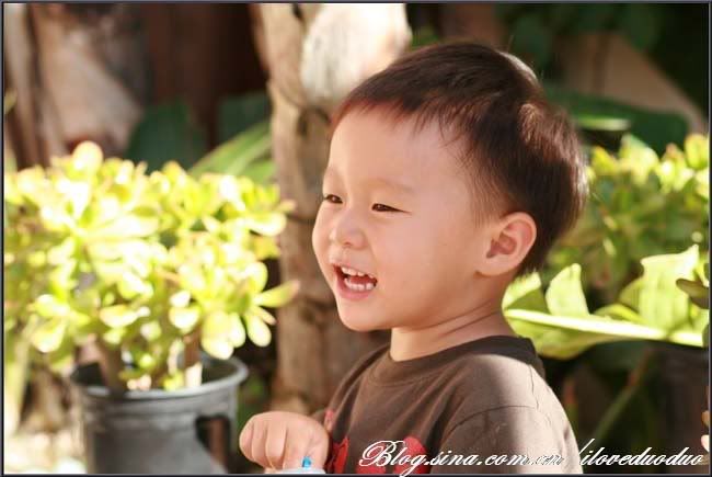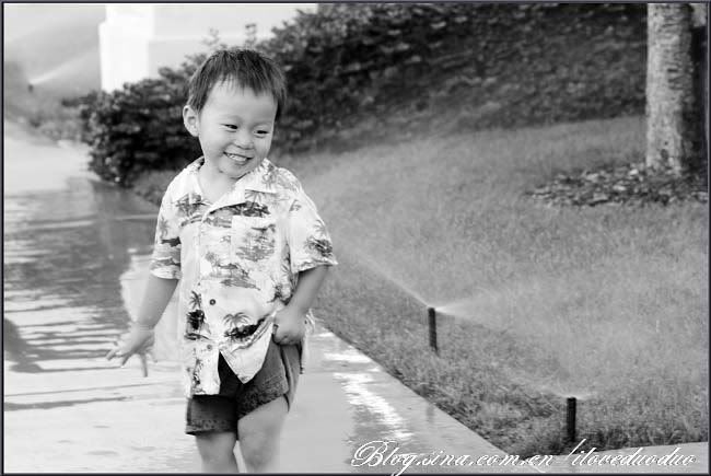 说起来这浇草的水应该不是太干净,不过看着他这么快乐地玩着,实在不忍心剥夺他的这份快乐。于是眼见着酷酷的夏威夷小子成了一只落汤的小公鸡,赶紧拎回家洗澡水伺候。。。