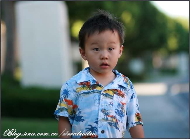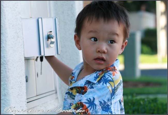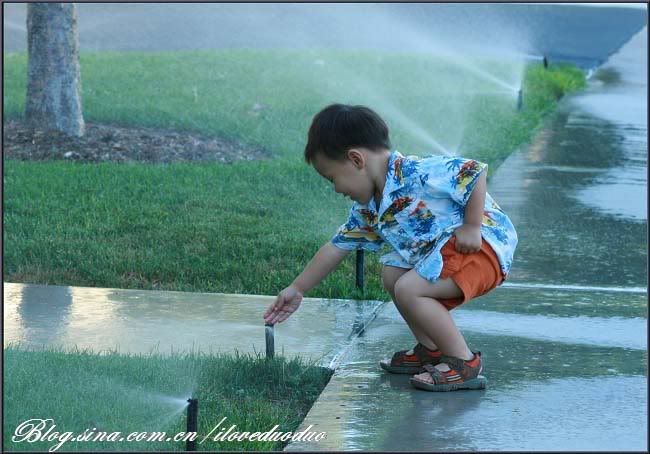 给小少爷穿了一件新买的夏威夷风情的小上衣,一上身就让我眼前一亮,'酷'就一个字。出了门先是少爷要拿钥匙开信箱,过了把钥匙开锁的瘾后继续前行。没两分钟的功夫,所有的喷水装置开始启动浇草坪了,于是小少爷收获了一份误打误撞来的欢乐。。。