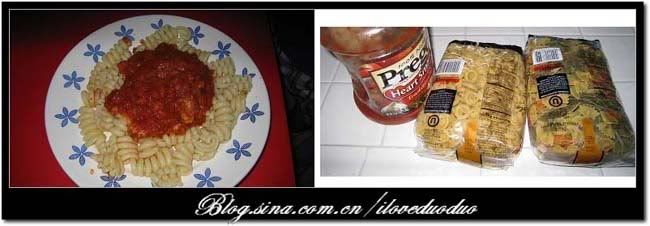 洋葱半个,虾或鱼肉适量(或者是肉丸子,香肠)。锅里倒油少许,油开后加入洋葱和肉馅炒熟。意大利面条的酱有成品卖, 直接倒进锅里。将洋葱,肉和面条酱搅拌均匀。最后将做好的酱浇到煮好的面条上,喜欢的人还可以撒上Cheese粉。