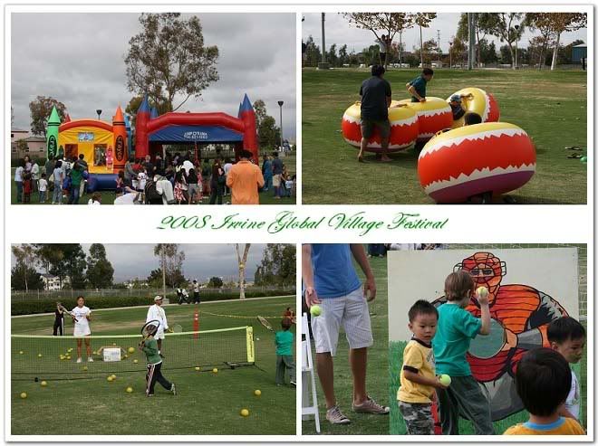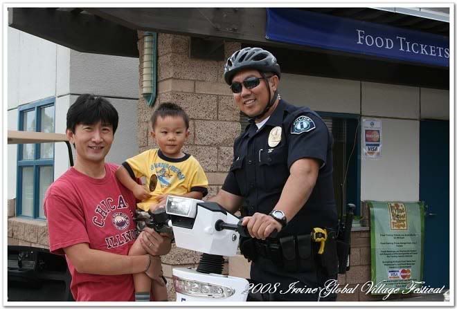 吃完午饭,我们赶去Irvine Village Global Festival. 其实这个活动每年都有,对我们来说今年是第一次。地点在我们常去的市府后的公园里。三个大草坪上都搭上了白色的帐篷,最引人注目的是几个硕大无比的充气滑梯。感觉规模很大,活动也很多,吃喝玩乐一应俱全。让多多记忆深刻的是和警察叔叔合影留念,最近小子特迷警察和消防员,感觉美国的警察和消防员都人高马大,而且其中很多长得都特别帅呢。