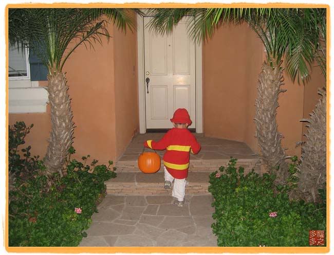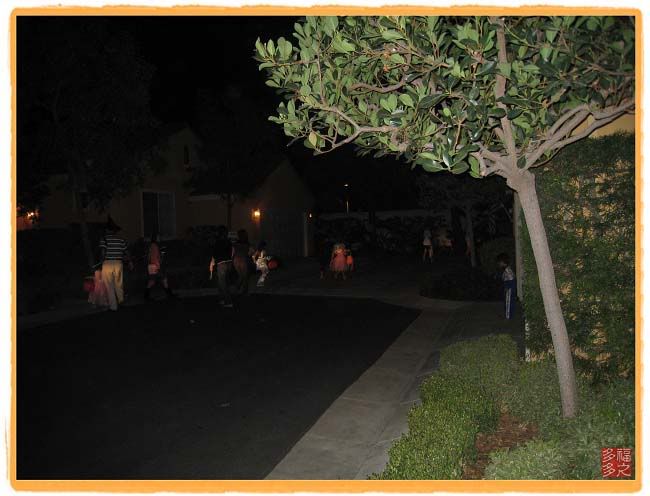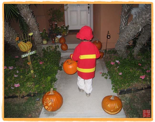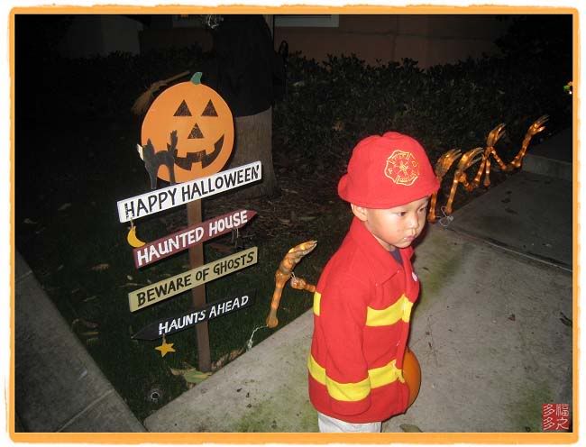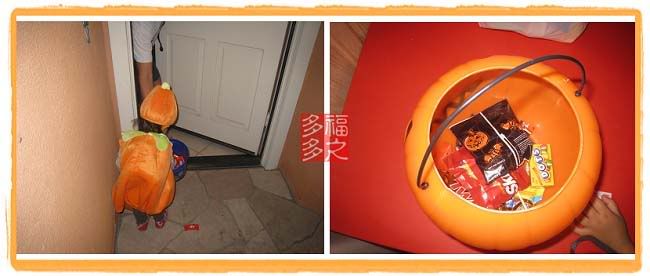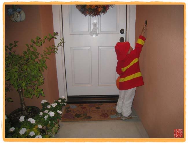 晚上回家,我带多多去要糖,这是小多生平第一次去trick-or-treat.去年他负责在家里给上门来要糖的小朋友发糖。这第一次的体验小多表现还不错,我给他示范了第一家如何按门铃,跟他说只能拿一块糖,要说谢谢。后来人家就自己去按门铃,挑糖果,跟人家说谢谢,只是说的声音小了点。只在我家的小区走了半条街,他就要回家了,到了家后继续负责发派糖果,一边给人家一边说Here you go,还跟人家道别,衍然是个老手了,不过比较抠门,一个人就给一块,倒也符合我教给他只能拿一块的原则。