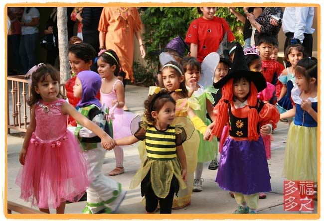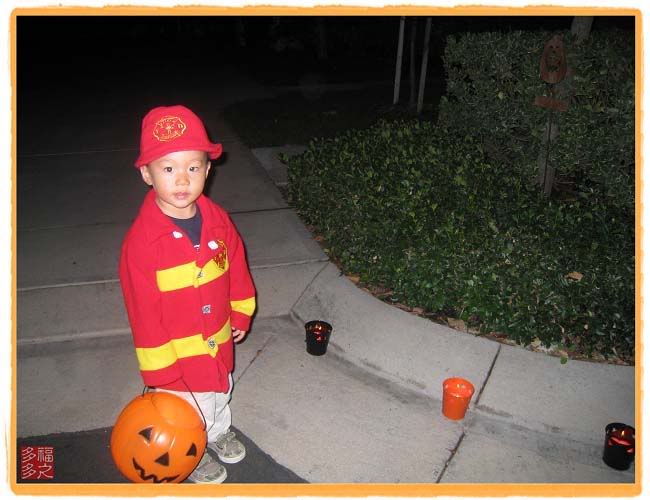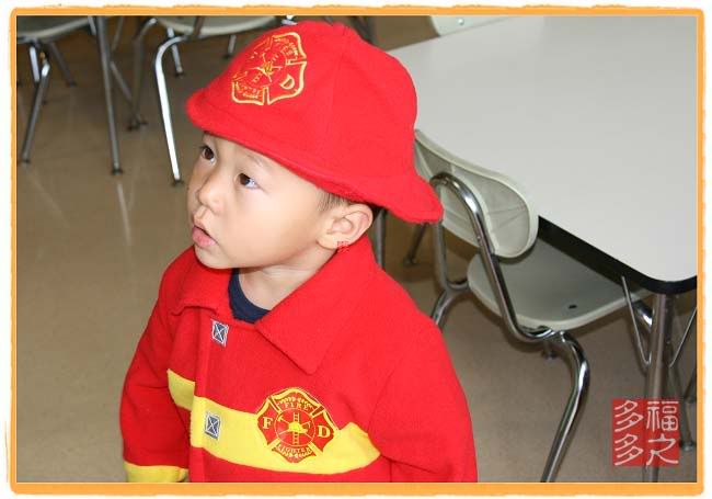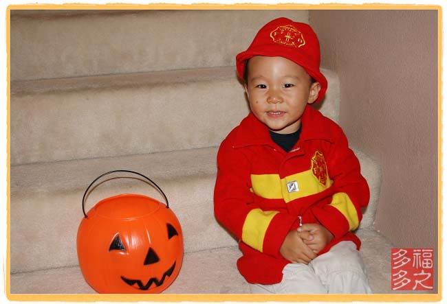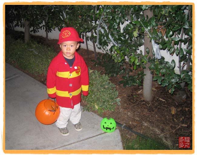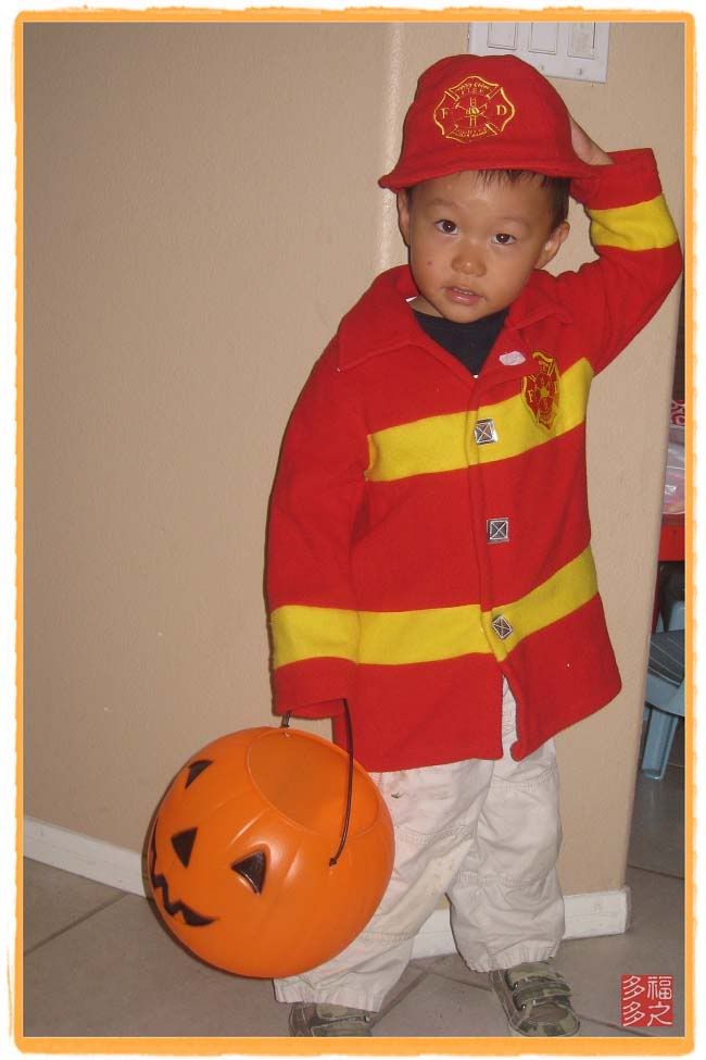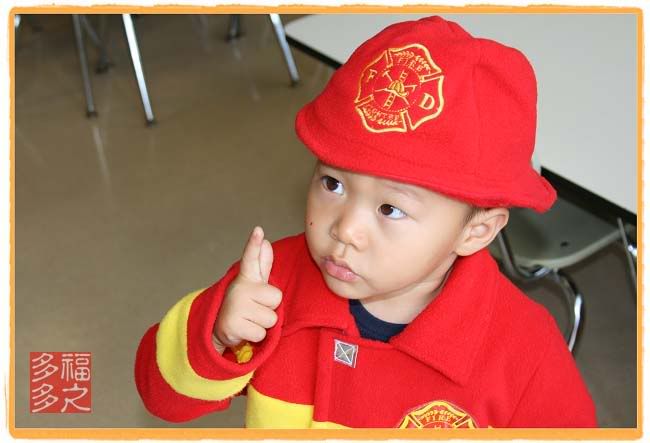 多多还没到要自己选万圣节装扮的年龄,去年的万圣节我们扮的是中国小皇帝,今年我给他买了一套消防员的服装,多多很是喜欢,没到万圣节就经常穿上在家里走来走去地炫耀。今天我们正式穿好消防员的装扮参加了幼儿园每年的万圣节大游行,我和其他无数的家长拿着长枪大炮去充当狗崽队员,在playground和parking lot占据好有利地形,等孩子们一出场便是一通地按快门。